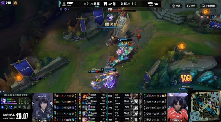 【22:07】NIP率先拆掉下路高地,Monki潘森被迫强开但是正面Cube安蓓萨空大了!Guwon梦魇反手关灯配合纳尔开冲切掉了About伊泽瑞尔,WE上野顶着维克托大招也击杀不掉残血的Zhuo萨勒芬妮,NIP轻松再打一波0换5团灭WE,一波结束比赛横扫对手,拿下二赛段的首胜!
