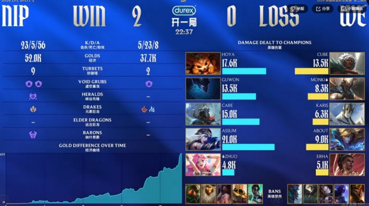 第二局Guwon梦魇连续Gank上路帮助HOYA纳尔打出优势,WE则是连续针对下路帮助About伊泽瑞尔!但是中期NIP三分钟内两波团战让Assum艾希连续收割,NIP两波团战大胜之后拉开经济差,随后中路4人打出0换3之后拿到新生的大龙,直接领先一万之后比赛也没了悬念!最终NIP下路团战0换5团灭WE,一波结束比赛拿下二赛段首胜!