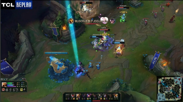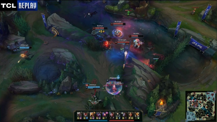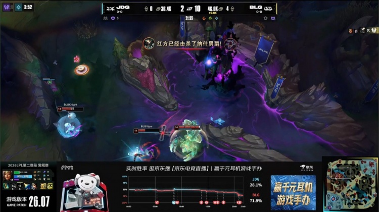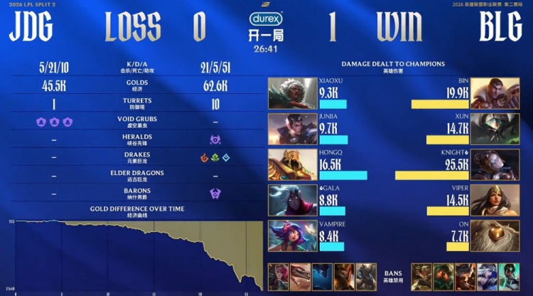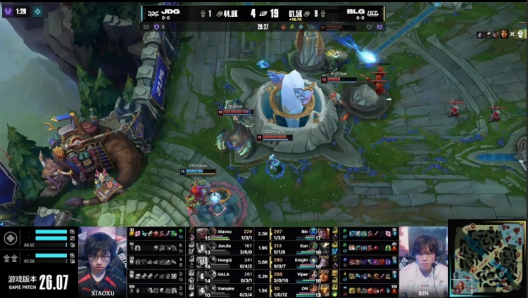 后续BLG下路推进团灭JDG,Xun蝎子斩获三杀。龙魂团knight发条再杀GALA,Xun城墙蝎子不掉血,knight发条爆轰三杀,BLG打出0换4,一波推平JDG基地先下一城。