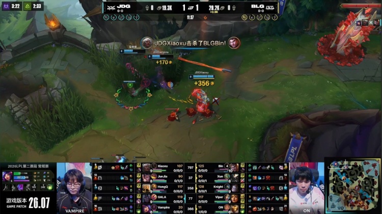 第一局前期中路3v3,knight发条开大拉回Vampire妮蔻,ON巴德击杀JunJia赵信拿到一血,BLG经济领先1k。随后Vampire妮蔻上路变小兵开大控住Bin杰斯,Xiaoxu安蓓萨跟上拿到Bin杰斯人头。