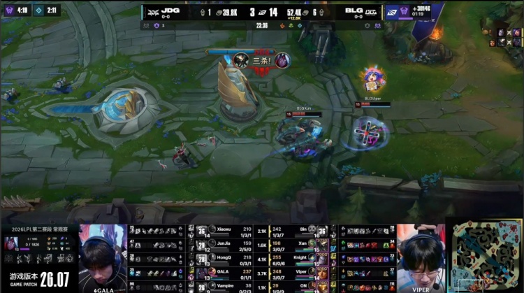 【19:51】下路混战,V神妮蔻开大开团先被秒杀,小徐安蓓萨TP落地直接被杀,Junjia赵信难逃一死,BLG瞬间打出0换3,回头吃掉小龙听牌电龙魂,Bin推掉JDG上路二塔,JDG三人来抓阿Bin,BLG支援到位,knight发条落地先秒GALA,JDG中野又被击杀,BLG打出1换3,回头拿到大龙,经济领先来到1w。