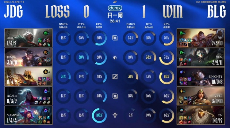 【5:10】中路3v3,knight发条开大拉回V神妮蔻,ON巴德猛A吃掉Junjia赵信一血,双方拉开,BLG经济小领先1k。