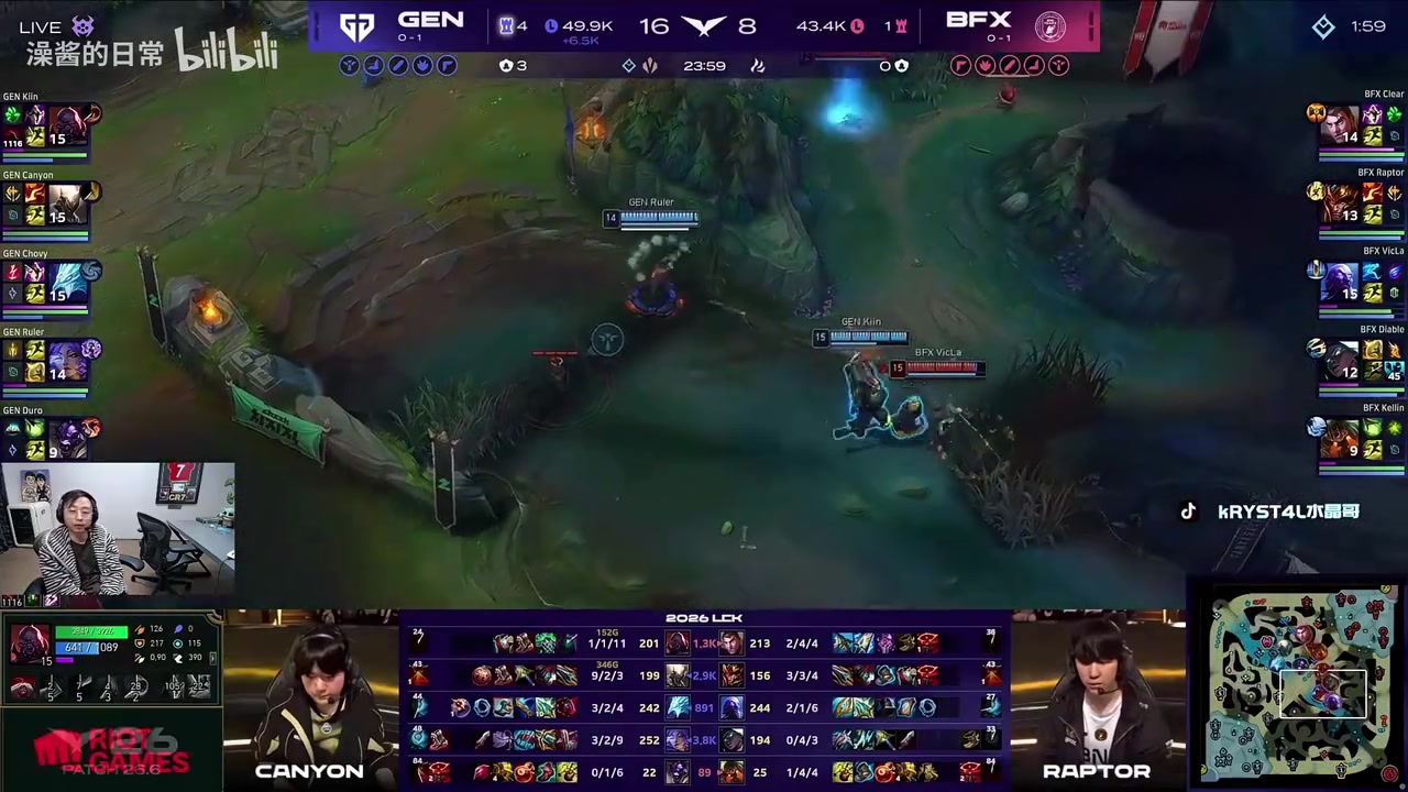 LCK第二赛段今日GEN对阵BFX,水晶哥直播看比赛;