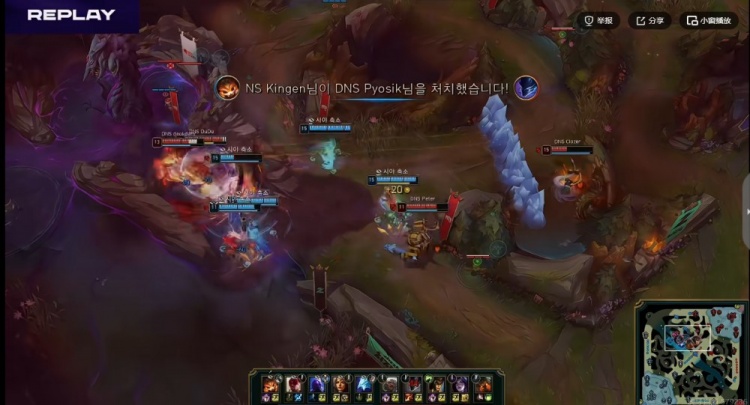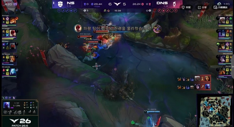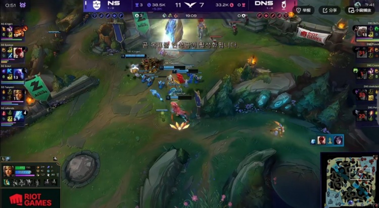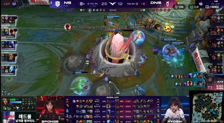 【11:25】DNS三人强杀Kingen纳尔失败,反而是NS下路三人抗塔强杀掉了Deokdam卡莎!回头NS还可以拿下二小龙!本局水龙魂!