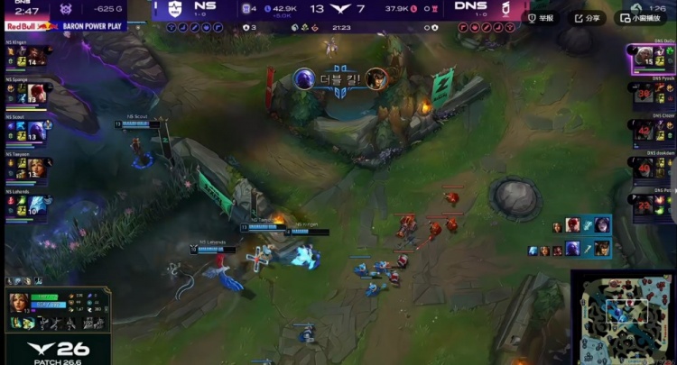 第二局比赛Lehends最后一手再选冰鸟辅助打出效果,而Sponge盲僧更是节奏不断!DNS则是连续针对上路,但是下路的Deokdam卡莎被越塔一波之后直接被Taeyoon希维尔压制!NS稳步推进拿下主动权+经济领先!虽然中期Pyosik梦魇用命抢大龙,DNS还赢下了龙魂团但是水龙魂被Scout瑞兹抢到了!最终的远古龙团NS在3V4的情况下毫无压力,上中野同时发力,强杀卡莎之后拿下远古龙,随后高地团直接一波结束比赛!横扫DNS之后拿到了开局的两连胜!