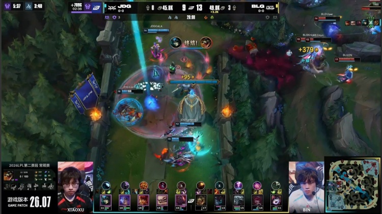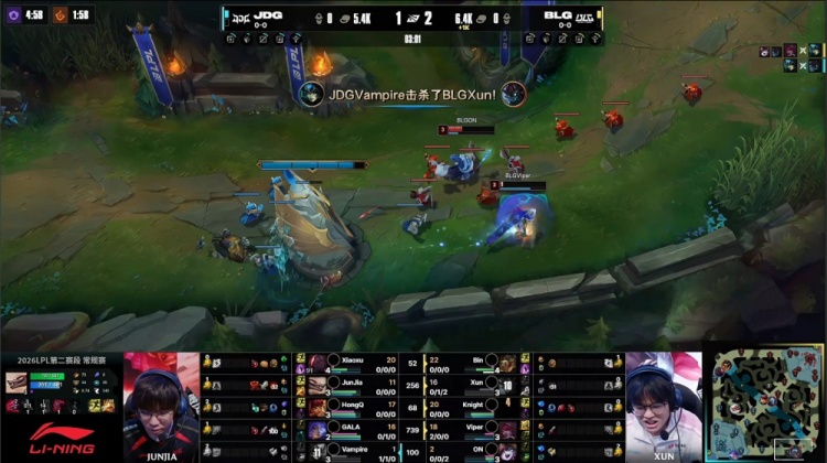 中期Bin哥鳄鱼上路1v2爆轰双杀被换,小龙团双方打野互换,JDG上野又被击杀,BLG打出1换2推掉JDG下路一塔,经济领先1k。随后Bin哥鳄鱼两度击杀HongQ安妮,BLG经济领先扩大至3.4k。