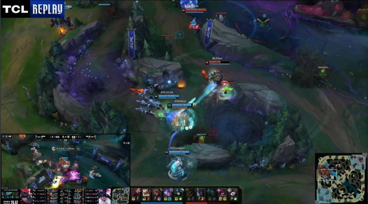 【23:15】HongQ安妮上路一塔下又被Bin哥闪现融化,野区JDG四打五,Viper霞来正面接团双杀,GALA芸阿娜开大击杀Viper残血撤退,BLG打出1换3,BLG经济领先3.4k。