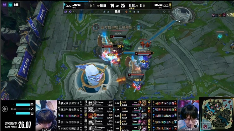 【25:38】JDG搏命开大龙,Bin哥没TP姗姗来迟,JDG正面吃掉大龙,侧面Bin包夹留人未果,Bin哥抗JDG上路二塔大人头被V神娜美拿到,HongQ安妮来到2-5,双方打出1换1,BLG经济领先3.4k。