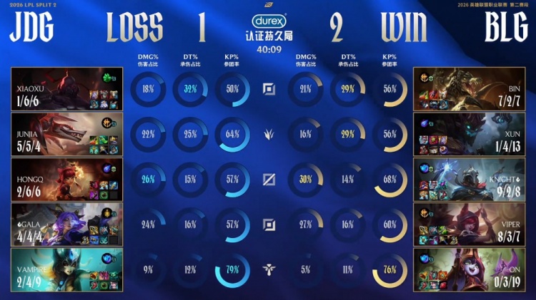 最终大龙决战knight维克托风暴肆虐瞬间双杀,JDG正面四人倒地,BLG推平JDG基地拿到比赛胜利。