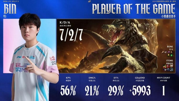 【21:28】阿Bin鳄鱼下路开大两刀剁掉HongQ安妮,BLG经济领先接近2k。