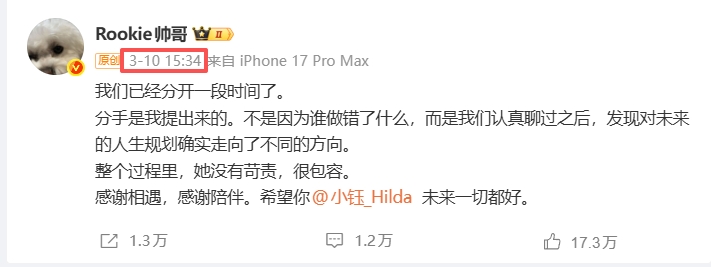 而Rookie是在3月10号才官宣与小钰分手结束9年感情,还不到一个月Rookie就被曝出新恋情。