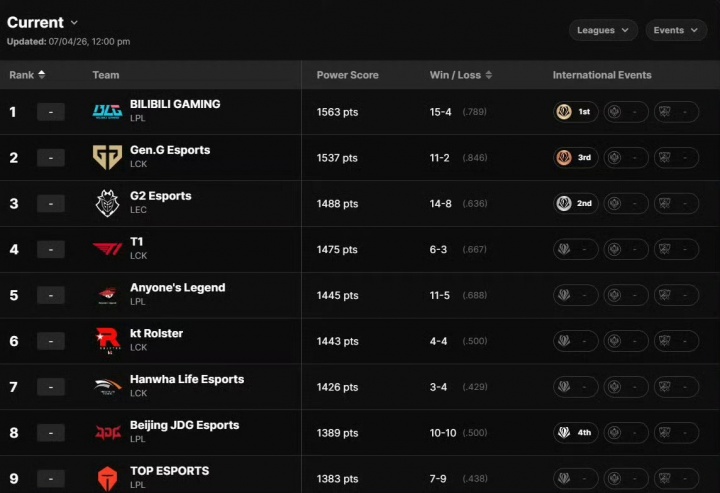 世界第一战队了解一下!全球战力排行榜更新:BLG问鼎 GEN、G2紧随其后