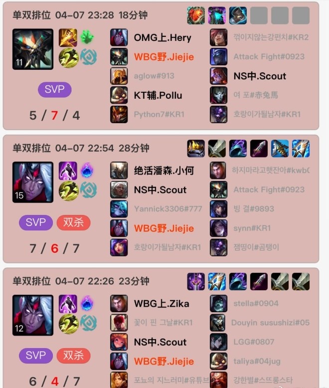 直播吧4月8日讯 韩服排位对局,WBG打野jijie连撞三把NS中单scout全部输掉,其中两把队友、一把对手;