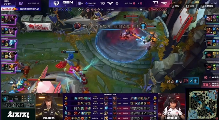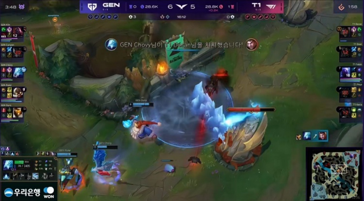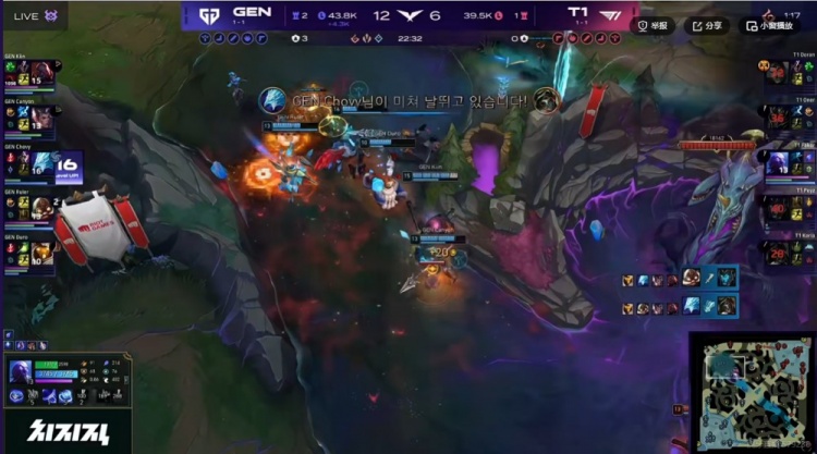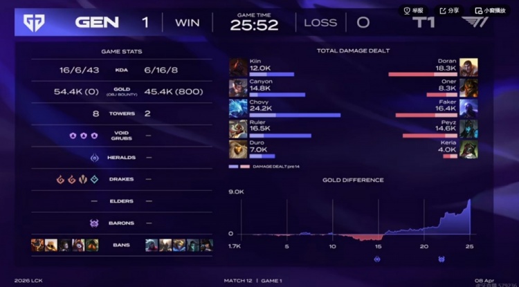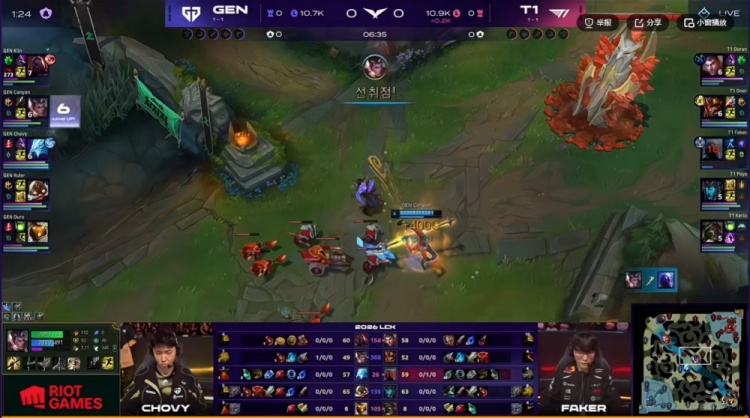中期无解肥的Kiin塞恩让T1完全无法处理,GEN持续拿下小龙给足压力,又在关键的河道团秒掉了TP绕后的Doran杰斯!T1少个输出位完全打不了!GEN打出0换4之后拿下大龙,随后野区再度逮捕杰斯,多打少上高!同样无解发育的Chovy冰鸟两个封墙配合队友先后击杀T1中下辅,GEN轻松结束首局比赛!