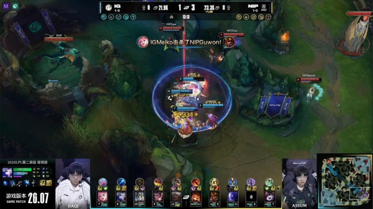 第一局前期Assum芸阿娜线上爆杀JiaQi艾希与Meiko萨勒芬妮。中期小龙团Guwon皇子开团被Renard加里奥击杀,Wei赵信搏命抢掉小龙,iG听牌火龙魂。后续上路Hoya大纳尔Renard加里奥,Assum芸阿娜再杀JiaQi艾希,NIP经济领先扩至4k。