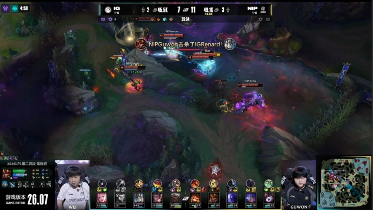 最终iG三龙加持冲上NIP高地拆掉两路水晶,Renard加里奥在野区打出绕后的guwon皇子复活甲,正面NIP不堪一击,iG推平NIP基地先下一城。