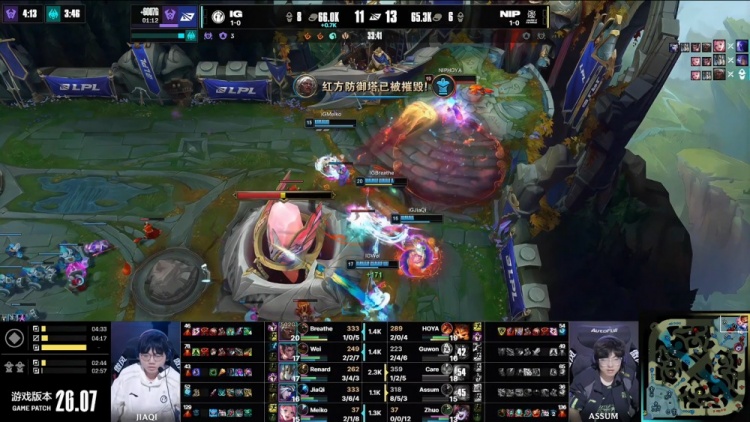 【15:01】Assum芸阿娜中路越塔再杀JiaQi艾希,上路Wei赵信联手Breathe安蓓萨击杀Care瑞兹,Wei随后拿到先锋,但NIP经济领先1.5k。