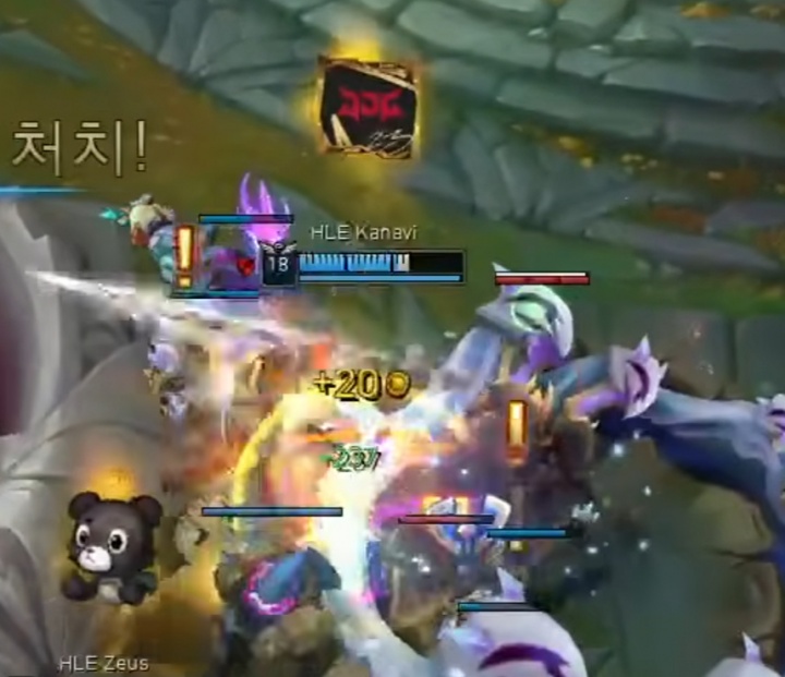 HLE打野Kanavi在比赛结束前,接连亮出了JDG、TES的队标。