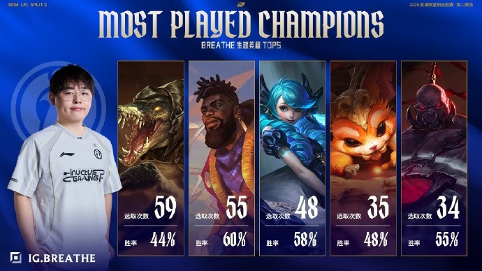 breathe与HOYA LPL比赛中的生涯英雄选取次数TOP5如下;