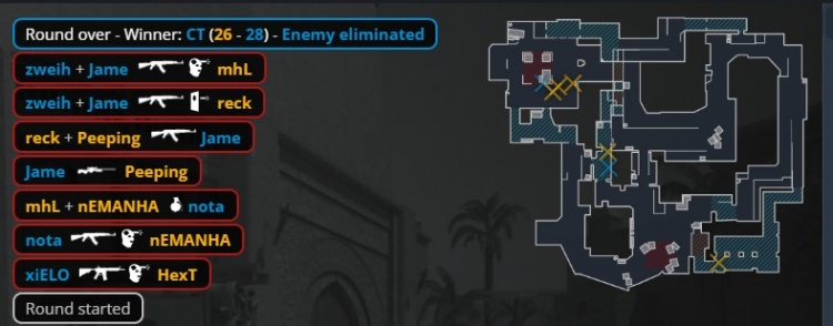 加时赛双方反复拉锯,经历五个加时赛,期间上帝大狙多次关键发挥,reck与nEMANHA手感火热,xiELO多次残局爆发,双方你来我往比分一路咬到26-26。