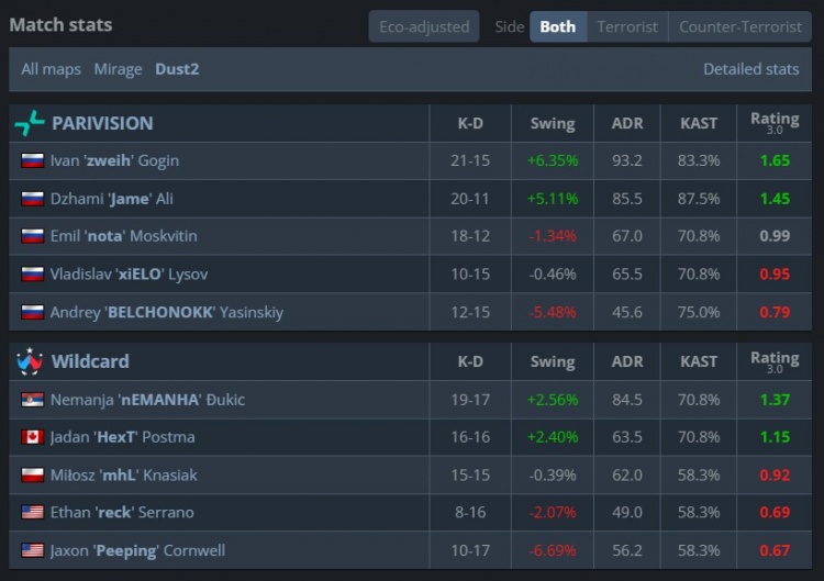 易边再战,手枪局KK双杀带队守A成功拿到第5分,PV连续将比分追至7-8。第16回合WC中门夹B得手,双方随后开黏比分交替上升。第20回合,peeping踩火进B打掉KK拿到第11分。PV连追2分,双方来到11-11。关键第23回合,WC进A下包,xiELO与nota双人四杀拆包拿到赛点,最终PV13-11拒绝加时赢下图二,两图横扫Wildcard,晋级淘汰赛!