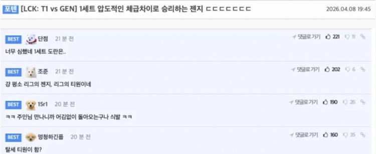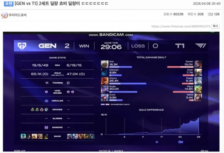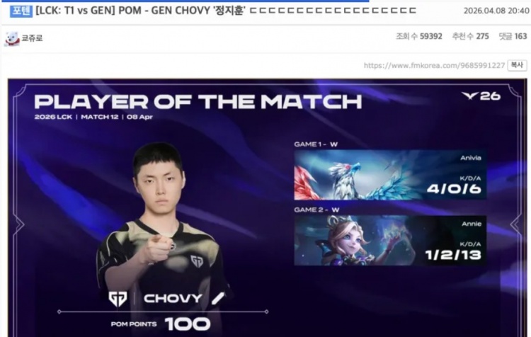 直播吧4月8日讯 2026LCK常规赛GEN以2比0战胜T1后,韩国FMKOREA论坛网友对此展开热议。
