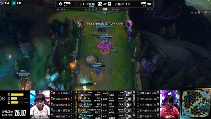 直播吧4月8日讯 今日LPL常规赛TES首局成功击败WE,而本场比赛中JackeyLove操刀飞机打出了8/2/17的出色战绩;而这也是Jackeylove复出以来的首次在比赛中超神。