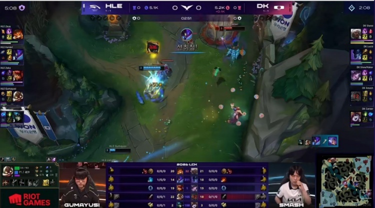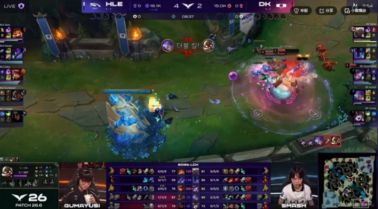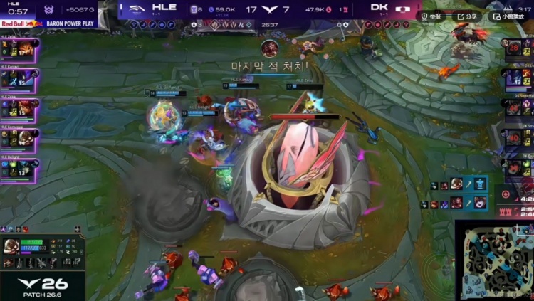 【16:02】Lucid梦魇开飞没能拿下击杀,HLE拿下先锋之后Kanavi卡兹克绕后,直接一套爆发秒掉了Smash芸阿娜!随后HLE直接中路放先锋,Career璐璐直接被Kanavi卡兹克秒掉了!不过DK上野打出配合强杀掉了Gumayusi库奇+Delight娜美,最终是DK的1换2!