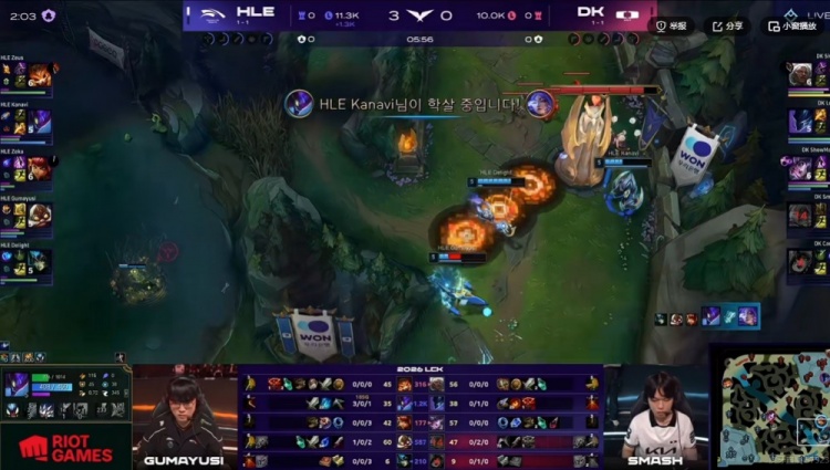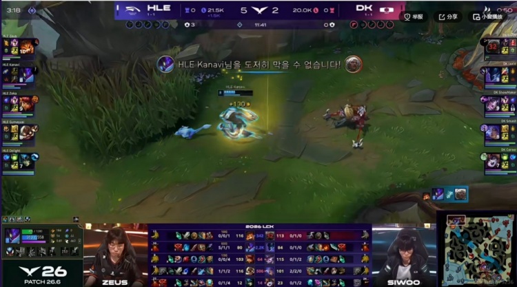 【11:41】Kanavi卡兹克gank上路,交闪单切掉了Siwoo安蓓萨!同时Lucid梦魇飞下,配合队友强杀掉了Gumayusi库奇!不过Zeka安妮支援到位,一个砸大配合队友换掉了Smash芸阿娜!总结是HLE的1换2!