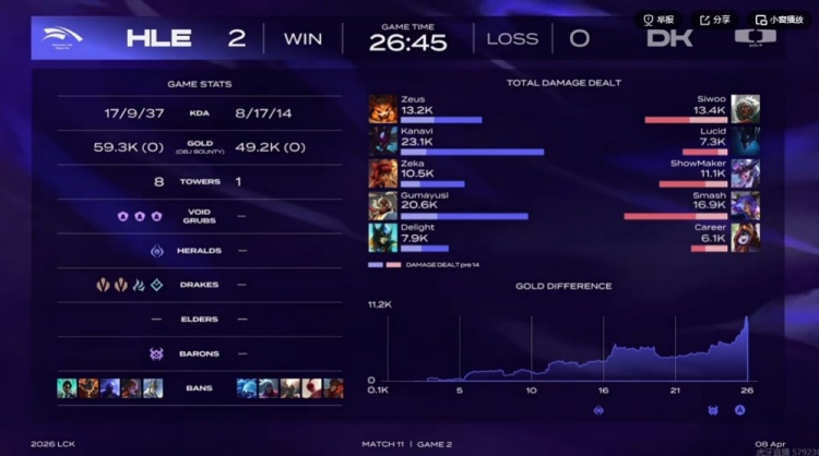 直播吧4月8日讯 2026年LCK来到新的一周,今天的首场比赛是DK对阵HLE!