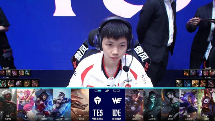 最终TES拿到大龙冲上WE高地推掉中上两路水晶,哥哥艾希一箭击中Monki赵信配合fengyue萨勒芬妮大招,大军压境,TES强行推平WE基地拿到比赛胜利。