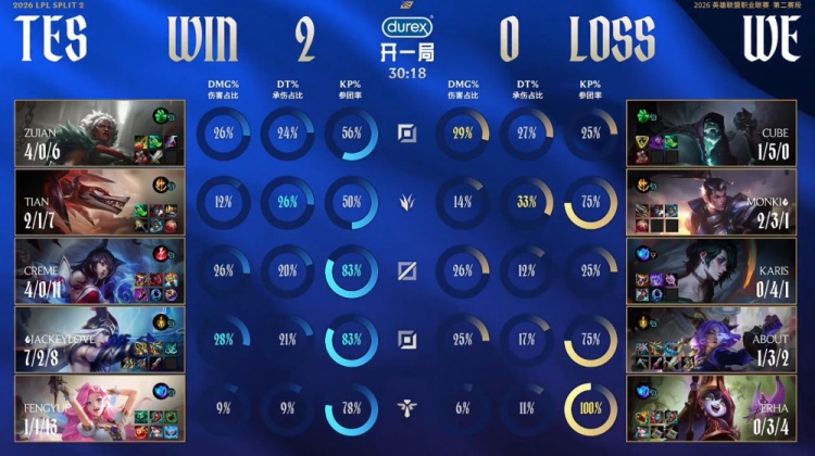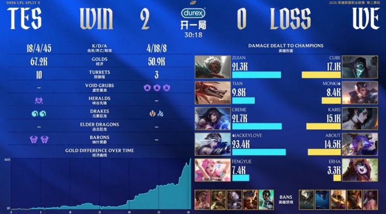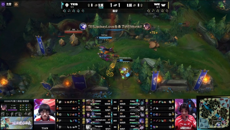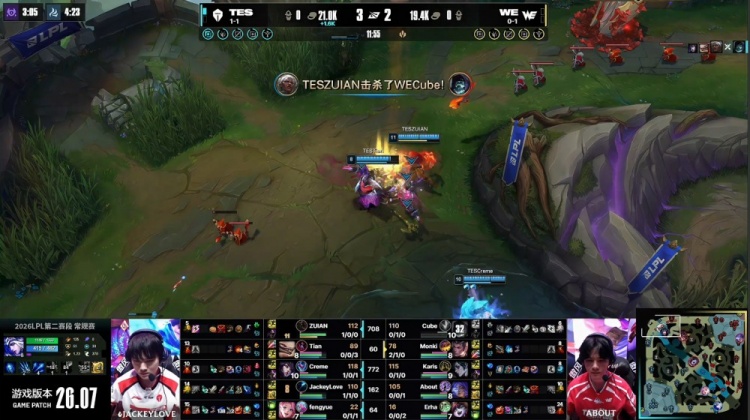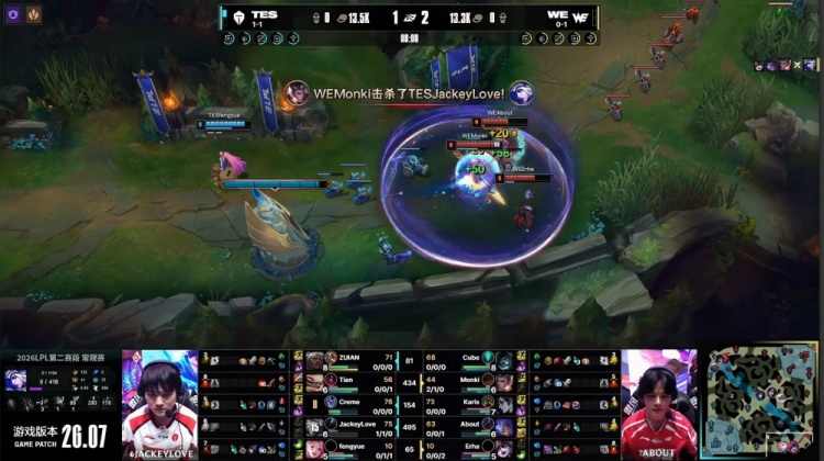 直播吧4月8日讯 2026LPL第二赛段常规赛组内赛继续进行,今日第二场比赛TES横扫WE!