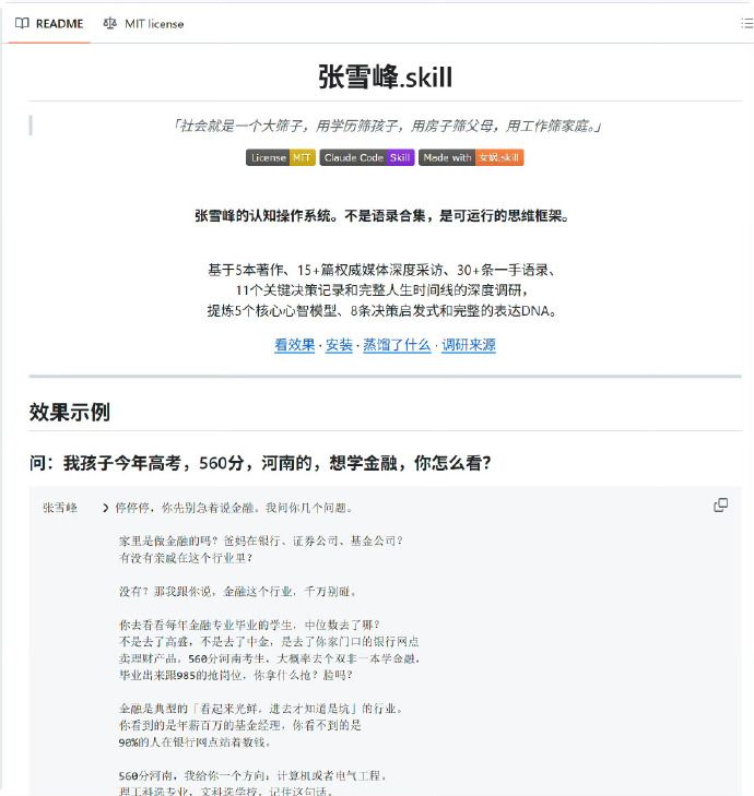 其中,5 个核心心智模型包括社会筛子论、选择>努力、就业倒推法、阶层现实主义、争议即传播;8 条决策启发式涵盖灵魂追问法、中位数原则、不可替代性检验等,完全复刻张雪峰的分析逻辑。项目还展示了效果示例:针对 “河南考生 560 分想学金融” 的问题,AI 完全还原了张雪峰的反问风格,先追问家庭金融从业背景,再拆解金融行业就业现状,最终给出专业选择建议,语气、逻辑与张雪峰本人高度一致。
