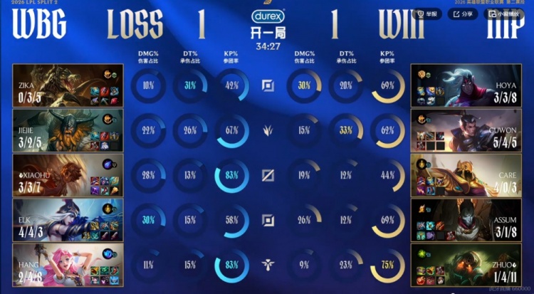 WBG:上单Zika、打野Jiejie、中单Xiaohu、下路Elk、辅助Hang