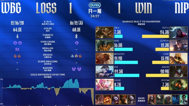 第二局比赛Elk艾希线杀+Jiejie奥拉夫gank帮助下路打出优势,不过NIP上路HOYA维鲁斯直接狠狠压住Zika鳄鱼让他毫无办法!中期NIP先拿两条小龙可以让局势往后拖!WBG想找机会效果都一般,反而是Elk艾希一次中路一次野区,两波阵亡之后让NIP拿下两条大龙让局面更加优势!最终龙魂团WBG被迫开大龙找机会,但是Guwon赵信复活甲+大招冲锋配合队友强切Elk艾希成功!NIP团灭WBG,一波扳平了比分!