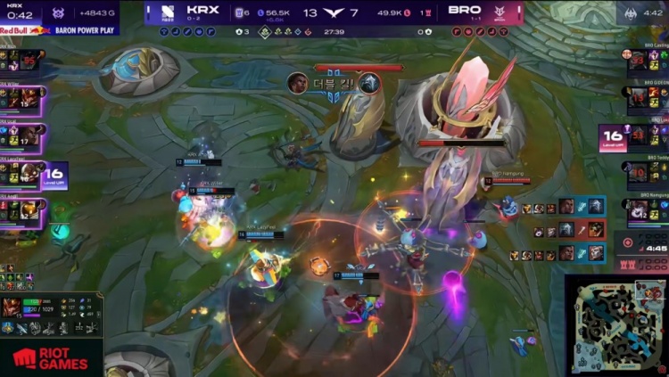后期KRX拿到大龙,一波推平BRO基地,完成让一追二拿到比赛胜利。