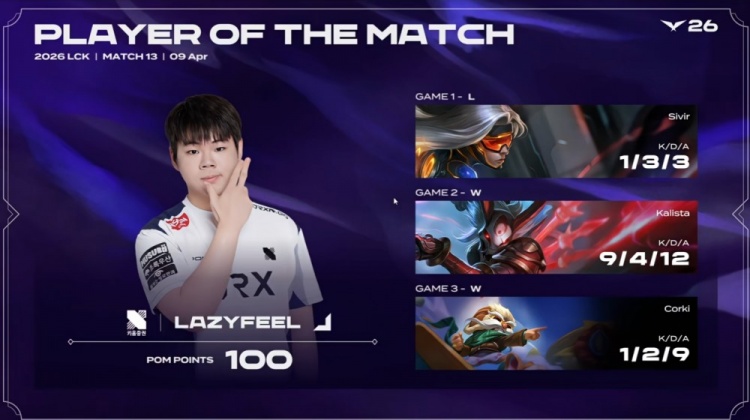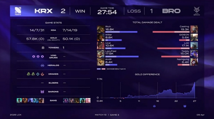 直播吧4月9日讯 2026LCK常规赛继续进行,今日首场比赛KRX让一追二战胜BRO!