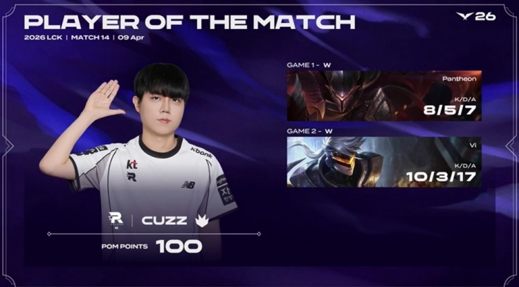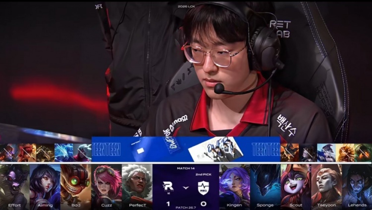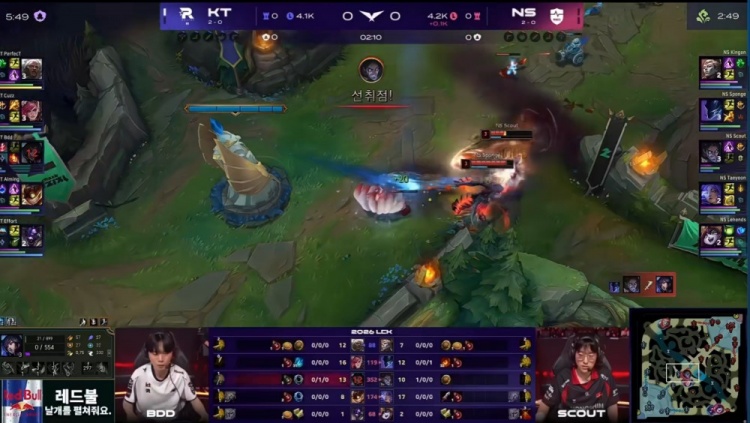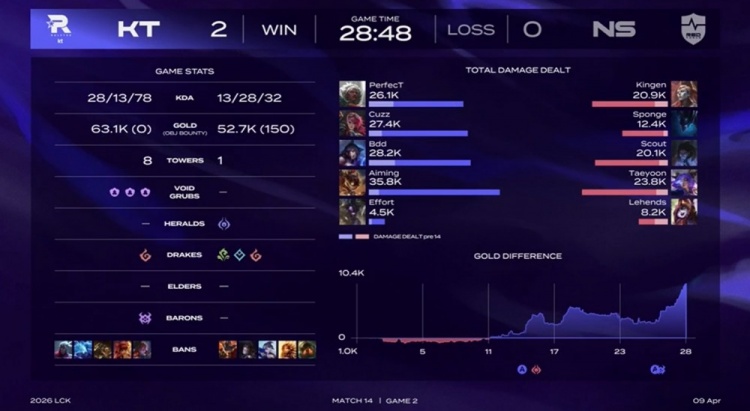直播吧4月9日讯 2026LCK常规赛继续进行,今日榜首大战KT横扫NS!