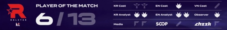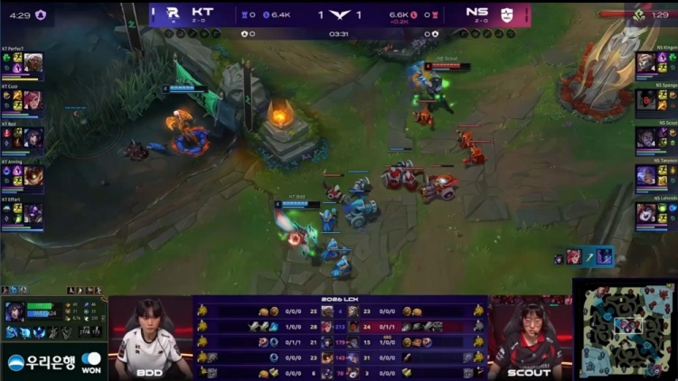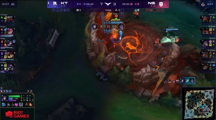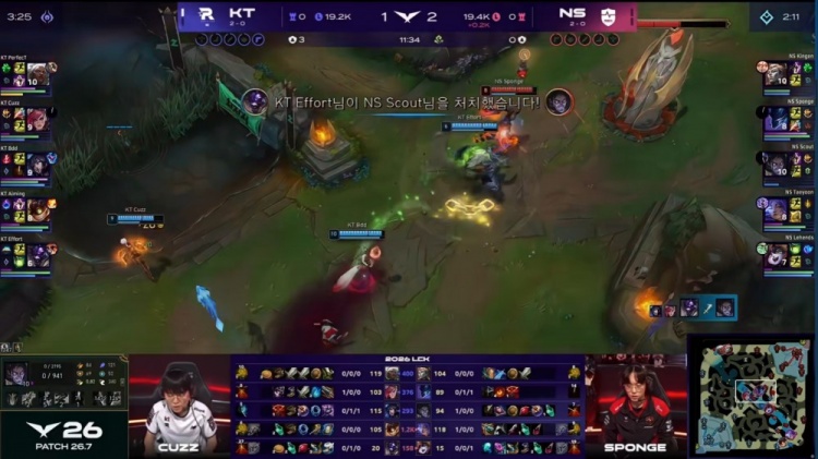 中期双方继续开战,Cuzz蔚再杀Scout,KT打出0换3。随后双方两波3换3,KT依旧保持保持3k经济优势。Sponge梦魇关灯飞Bdd惨被反杀,Aiming吉格斯与Cuzz蔚连续击杀Kingen亚恒与Taeyoon芸阿娜,KT打出1换5团灭NS并拿下大龙,经济领先6k。最终小龙团KT再打出0换3,下路推平NS基地拿到比赛胜利。
