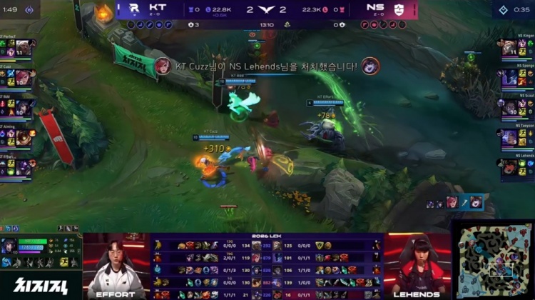 第二局前期双方打野中路相聚分别gank得手,后续Cuzz蔚连续锁头击杀Scout塞拉斯。小龙团Kingen亚恒TP落地惨遭拉扯,Bdd妖狐爆轰四杀,KT打出1换5团灭NS,经济领先4k。