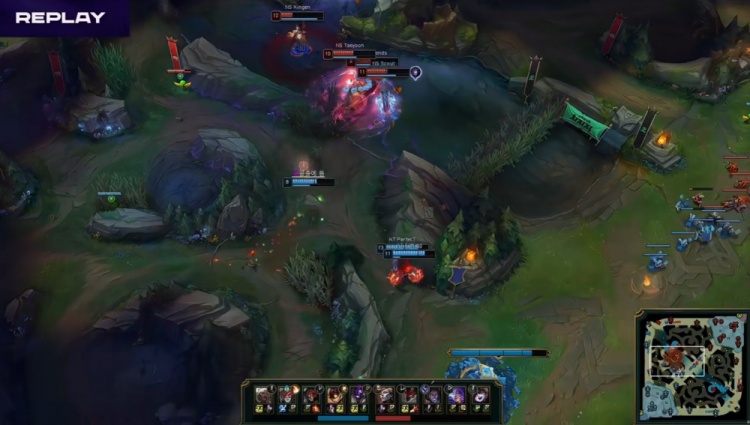 【22:51】大龙团,Lehends璐璐没大,Kingen亚恒落地就被Bdd狐狸魅惑,但随后Kingen砍掉Aiming吉格斯,Cuzz锁头击杀Sponge梦魇,Scout塞拉斯换掉Bdd妖狐,双方打出3换3。