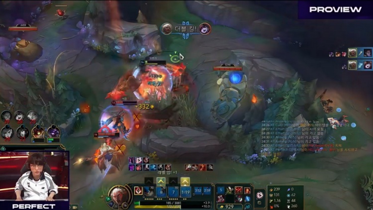 【24:12】野区混战,Bdd狐狸被Scout塞拉斯锁头送Taeyoon芸阿娜人头,Scout塞拉斯继续开战但被PerfecT安蓓萨反杀,PerfecT开大残血强换Sponge梦魇得手,双方打出3换3,KT经济领先3k。