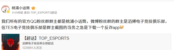 而昨晚TES官方发文澄清,表示官方群群主都是桃浦小话筒,并非TES电子竞技俱乐部。