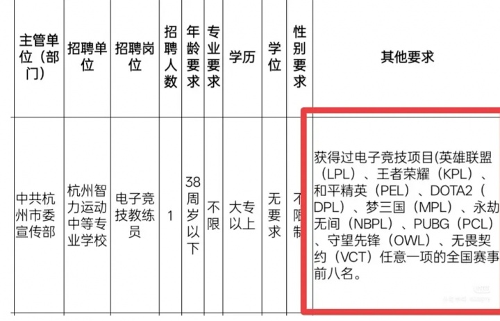 电竞教练的要求对比常见事业编明显放宽不少,年龄38周岁以下,学历大专以上,电竞能力要求LOL、DOTA2、王者荣耀、梦三国、永劫无间、PUBG、守望先锋、无畏契约等游戏在国内联赛有过前八的成绩。