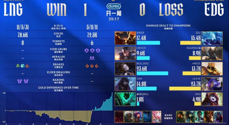 中期EDG连拿两条小龙断了LNG的节奏,LNG则是强行给三核换经济往后拖,28分钟EDG拿下纯种火龙听牌龙,LNG则是借助厄斐琉斯红蓝刀抱团rush掉大龙之后撤退!