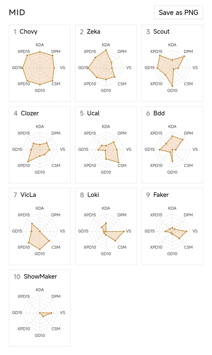 直播吧4月11日讯 近日,有国外粉丝制作了4月10日前LCK联赛的选手数据雷达图,其中Chovy虽然开幕输给KT但后续重新成为“联赛超”;Zeka以及Scout两位冠军中单的状态也开始回暖;而Faker虽然位列第九但数据还算能看,相比之下ShowMakers的数据则略显幽默!