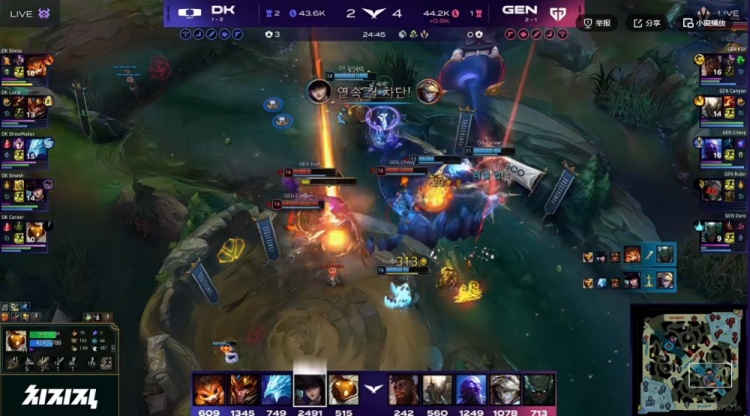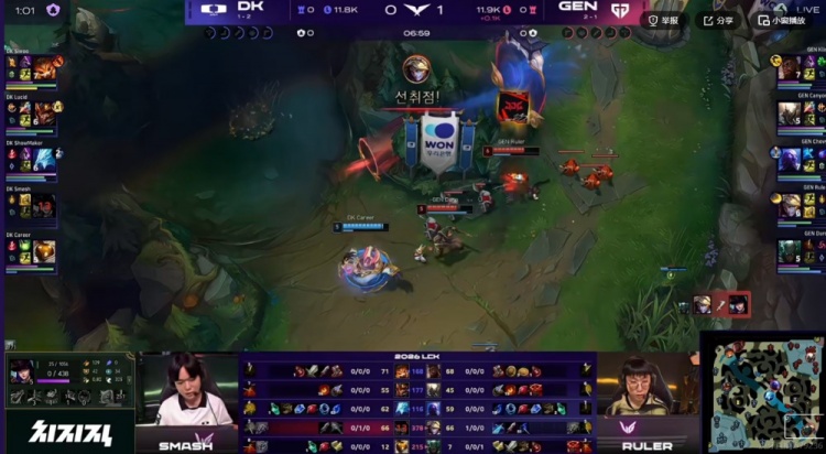 首局比赛DK开局三路线优,但是随后GEN下路组完成线杀帮助Ruler伊泽瑞尔压住了Smash女警!中期GEN想速龙避免女警强势期,还在第三条小龙借助完美拉扯打出0换3一度看到了胜利的曙光!