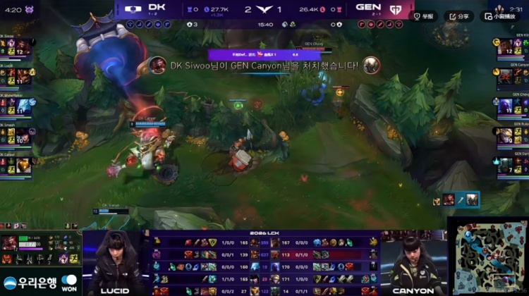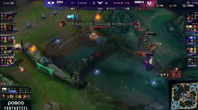 【15:05】Lucid皇子+Career巴德大招留住了没闪的Duro派克,DK将他逮捕之后顺势可以拿下先锋!Canyon潘森跳大下路gank失败,结果还被Siwoo大纳尔闪现一拍留住,自己还白给了!