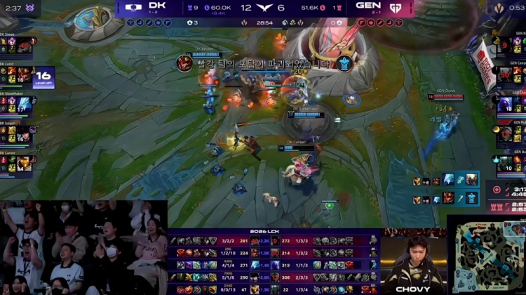 【26:29】中路GEN想强行找机会,但是SMK冰鸟一个墙封路,Canyon潘森直接没了!Lucid皇子用命盖大两个,绕后的Siwoo纳尔也完成包夹!DK再打一波1换4,从中路拆掉中二塔+中路高地!6K经济差了啊!