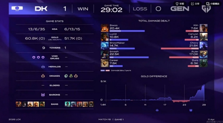 直播吧4月11日讯 LCK今天继续进行常规赛的较量,第二场是焦点对局,DK将要又一次联赛中遭遇“苦主”GEN!